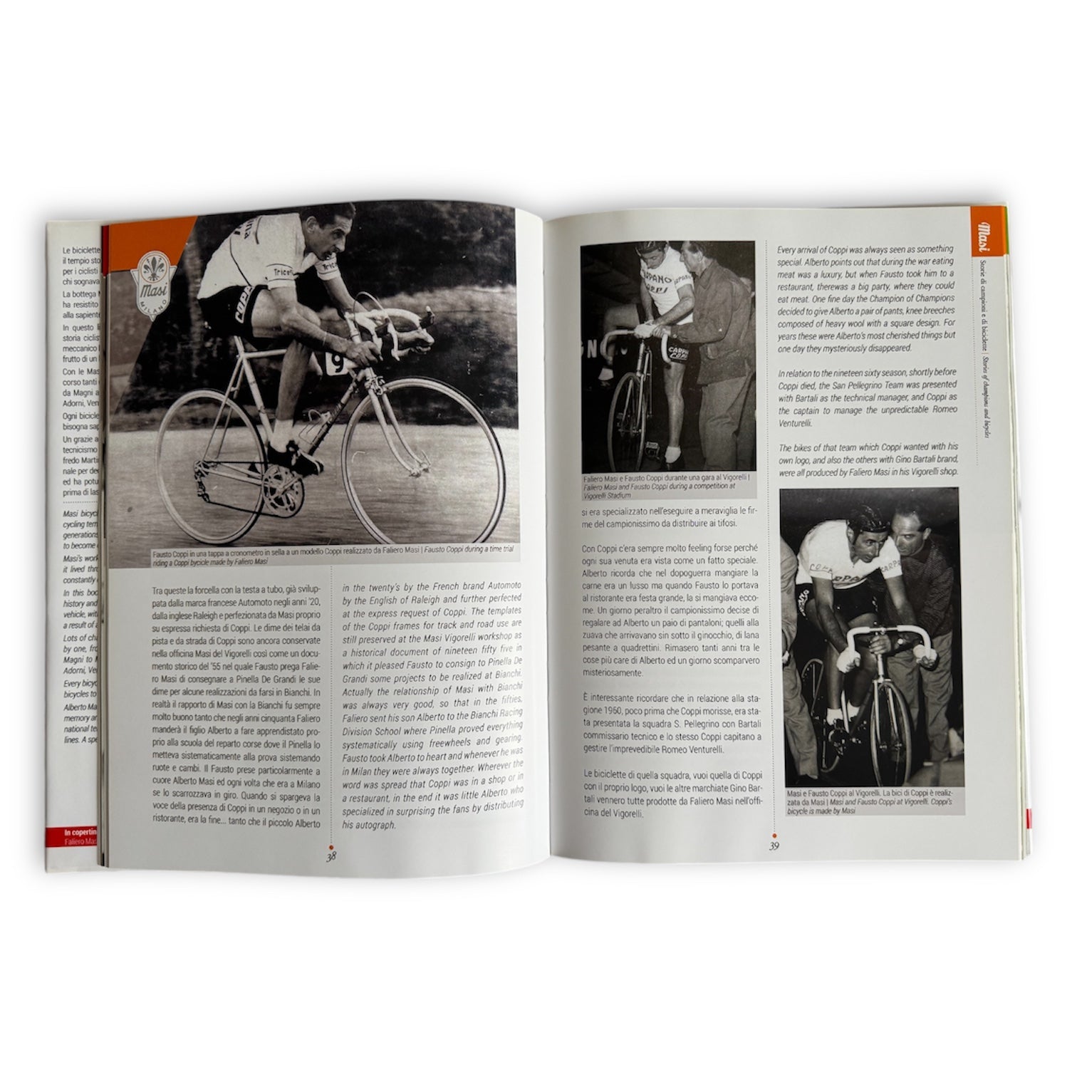This limited-edition book (New Old Stock from 2018) celebrates the legacy of Masi, the legendary Milanese workshop whose bicycles, crafted inside the Vigorelli Velodrome, became icons of Italian cycling history. Through archival photographs, documents, drawings, and previously unpublished material, it retraces a century of craftsmanship, innovation, and racing heritage. The volume explores the evolution of Masi’s techniques and materials, the stories of Faliero and Alberto, and the champions who rode their bicycles: from Bini to Coppi, from Maspes to Bobet, from Magni to Merckx, and many others. It also shows a timeline of models such as the Speciale Corsa, Prestige, Gran Criterium, 3V, and many others. Each chapter blends historical narrative with technical insight, revealing how Masi bicycles achieved their almost mythic status across generations. Hardcover 30x22cm is limited to 200 numbered copies, each one signed by Alberto Masi, this edition also features an original metallic Masi headbadge applied to the cover. Bilingual Italian and English in a single volume. 185 pages. Printed in Italy.