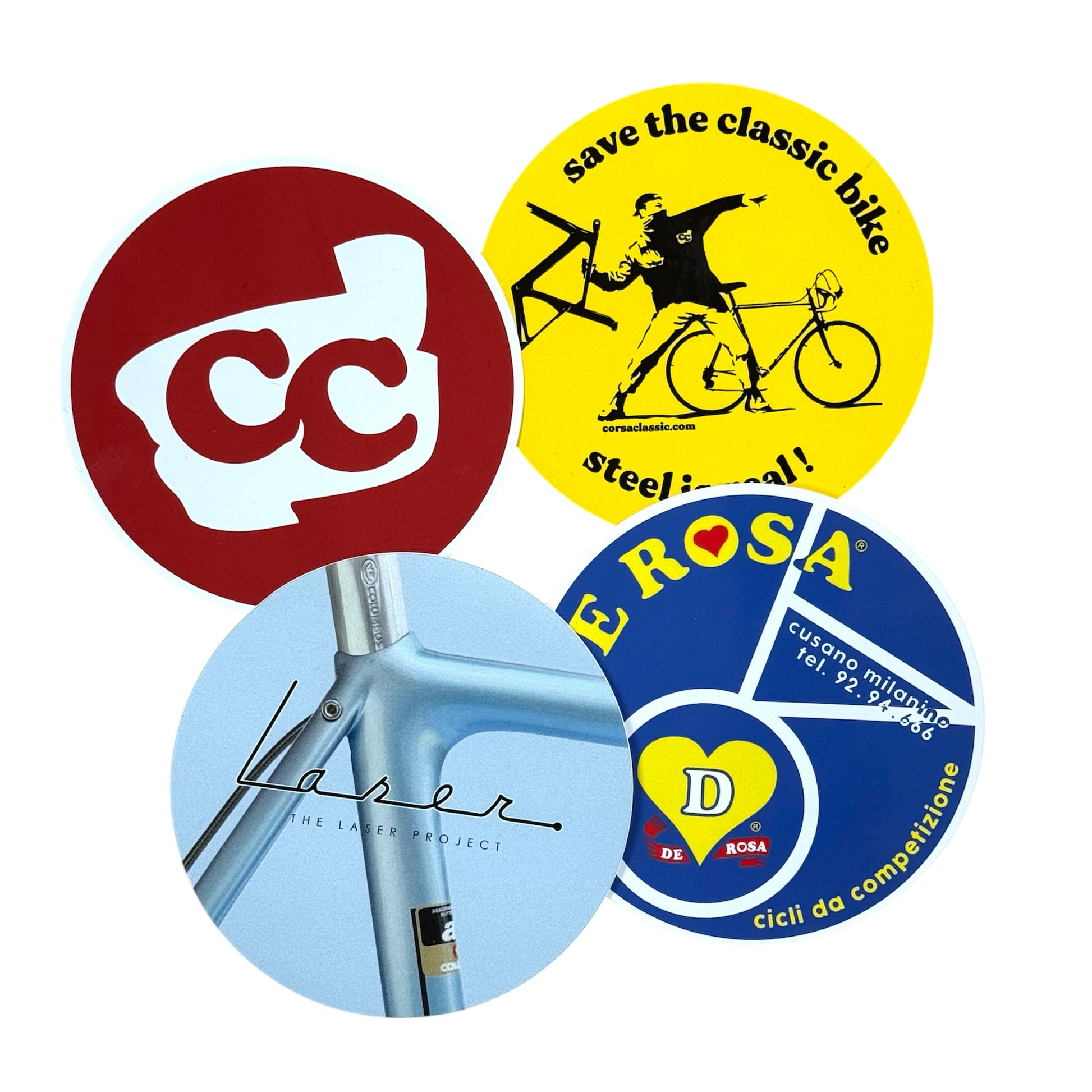 Set of 4 vinyl stickers: Corsa Classic, De Rosa, Cinelli Laser, and Save the Classic Bike! Each sticker measures 9 cm in diameter.