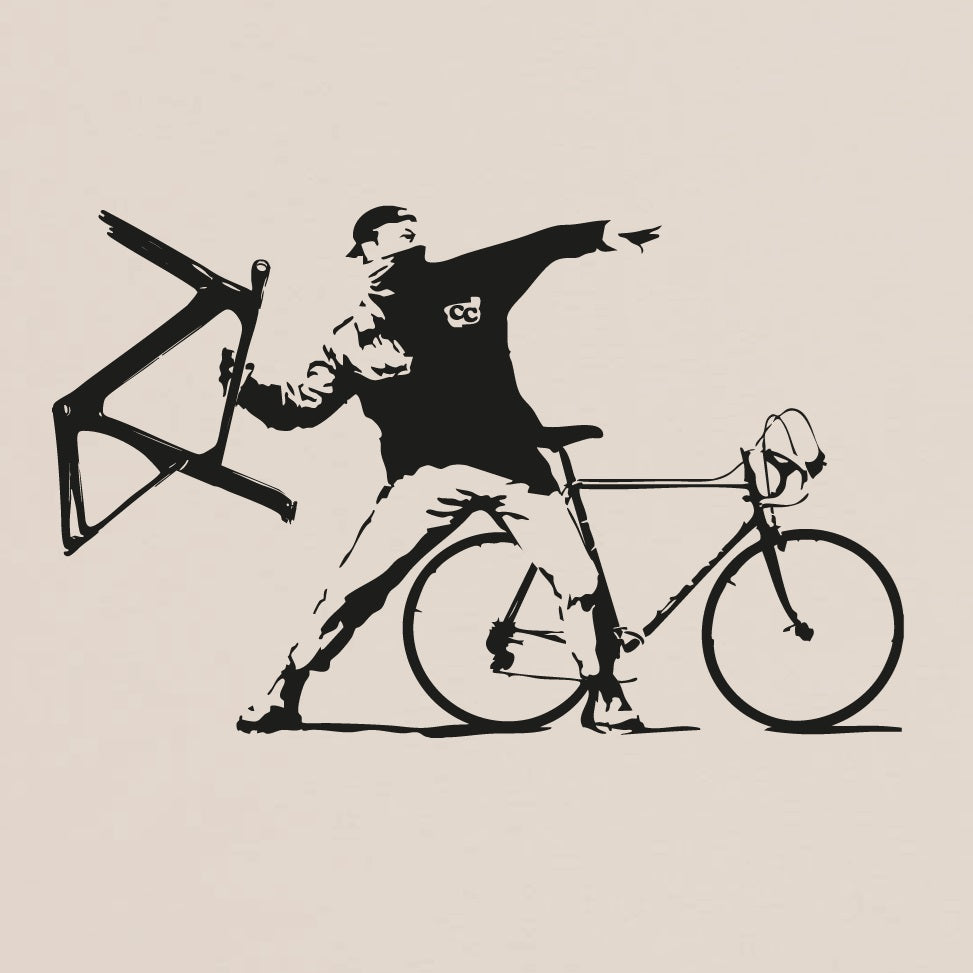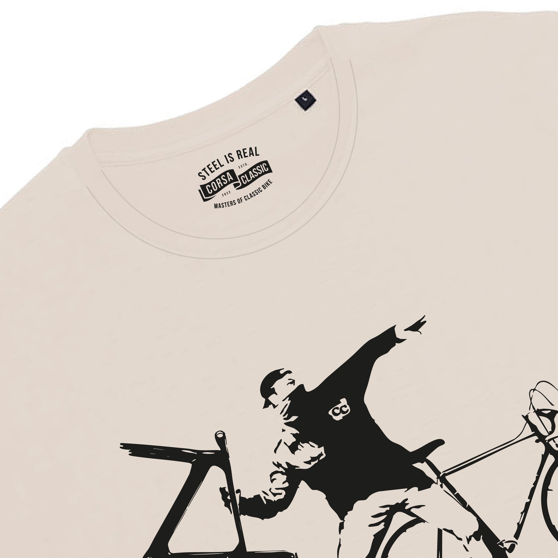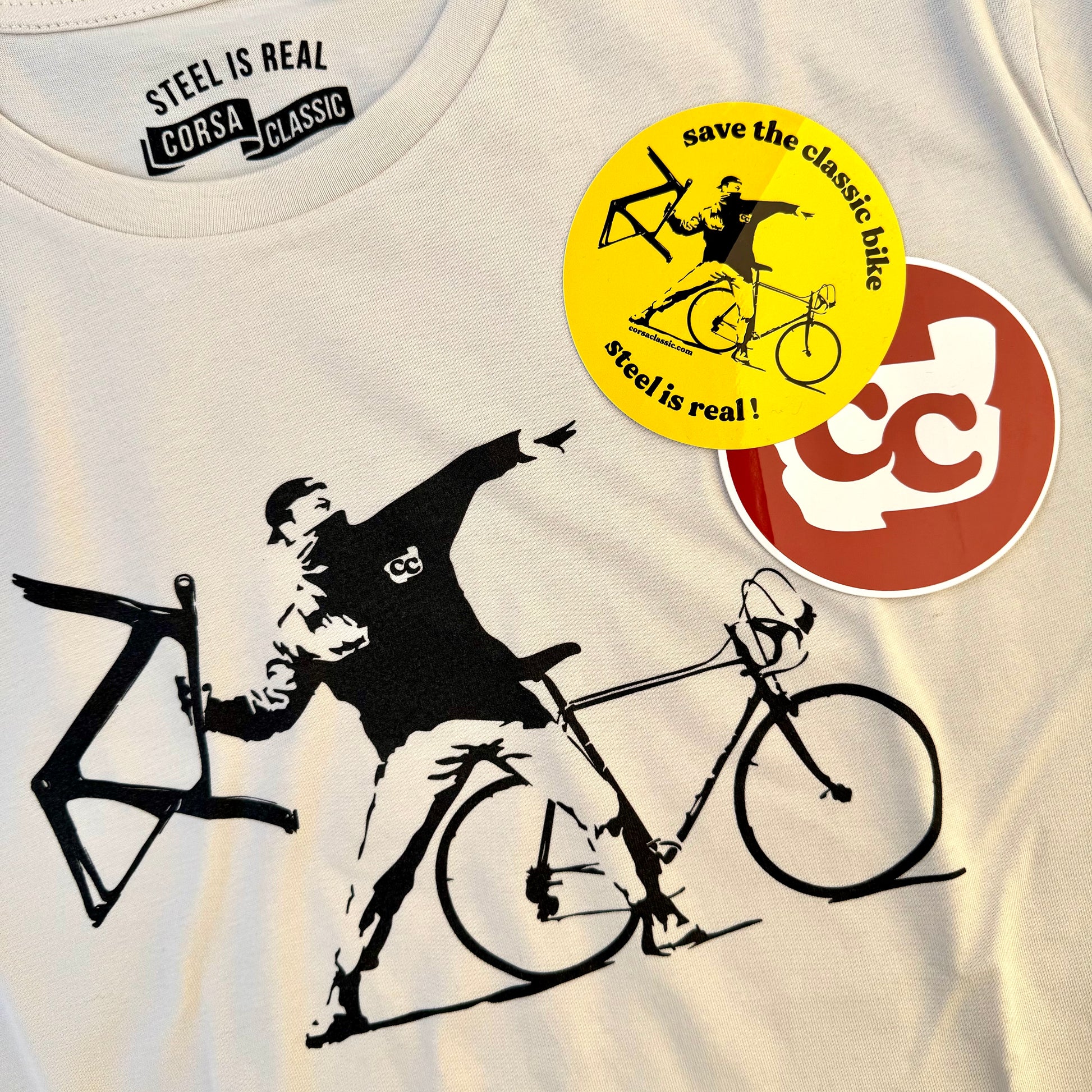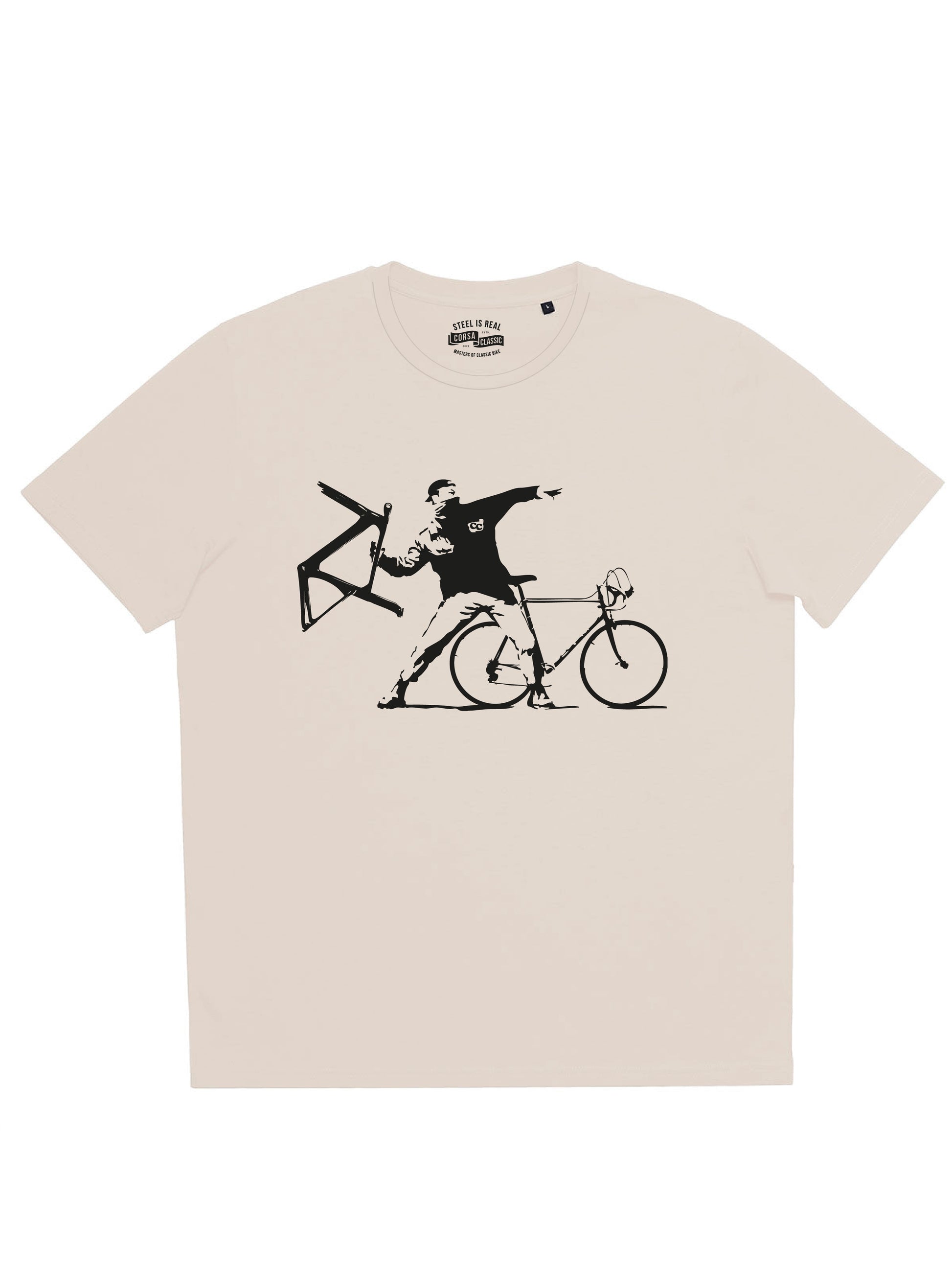 Introducing the viral and iconic design, "Steel is Real, Save the Classic Bike!". This striking artwork draws inspiration from the legendary Banksy flower thrower, blending a powerful message in the cycling culture. Celebrate the essence of steel bikes with a bold statement. Don’t miss the chance to own this unique piece, reserve yours today! Color is off white. Crafted from 100% Organic cotton, 150 grams. Please ensure you double check the chart.